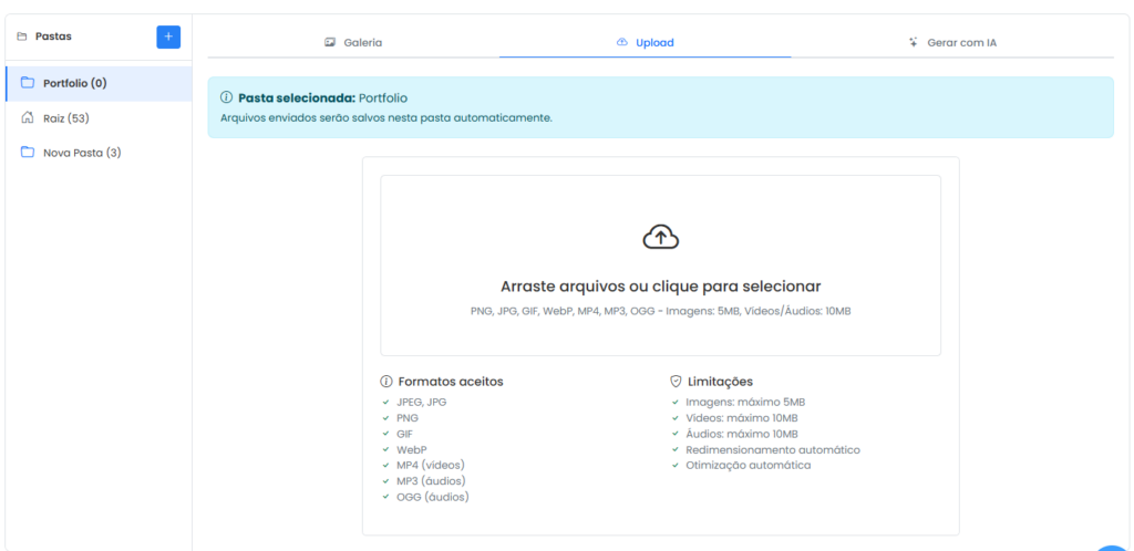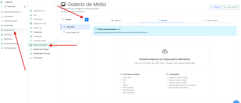 Para criar uma pasta vá em Recursos VIP → Galeria de Mídia → Clique no (+) para adicionar uma pasta.
