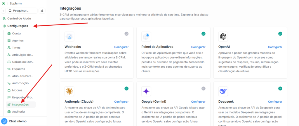 Para adicionar a chave de API da IA da sua preferência, expanda o menu da esquerda e vá em: Configurações → Integrações.