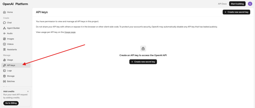 No menu (lado esquerdo), clique em API Keys.