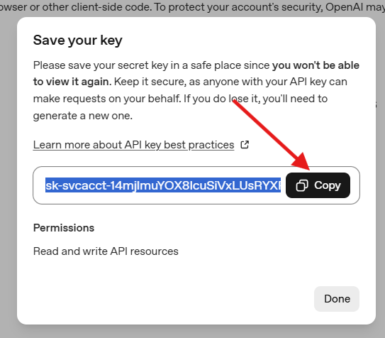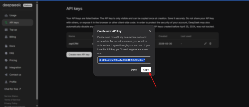 Em seguida, copie a chave de API e cole em um local seguro para ser utilizada na ZapiCRM, e clique em Done.
