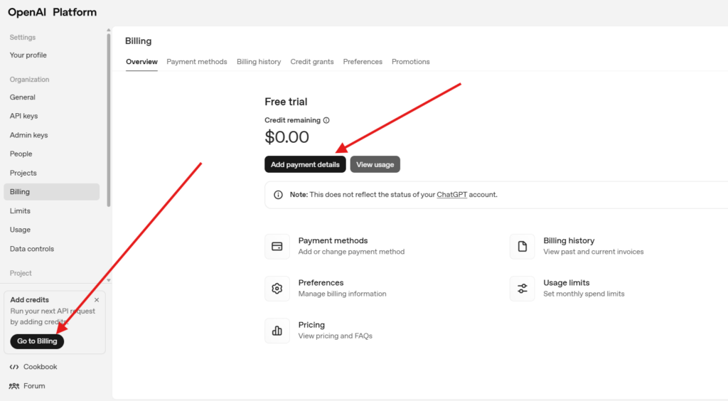 Clique em Go To Billing e em add payments details.