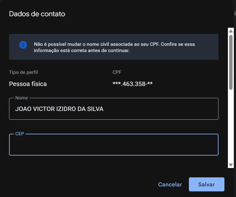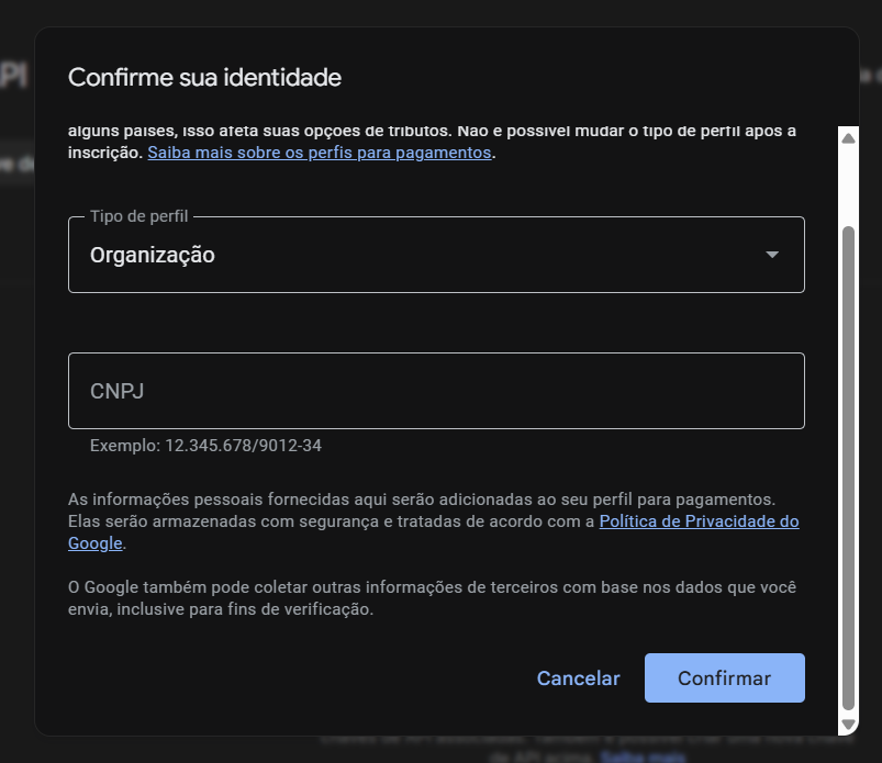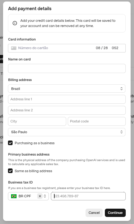 Adicione o metodo de pagamento e o endereço. Em business tax ID: escolha CNPJ ou CPF. Então clique em Continue.