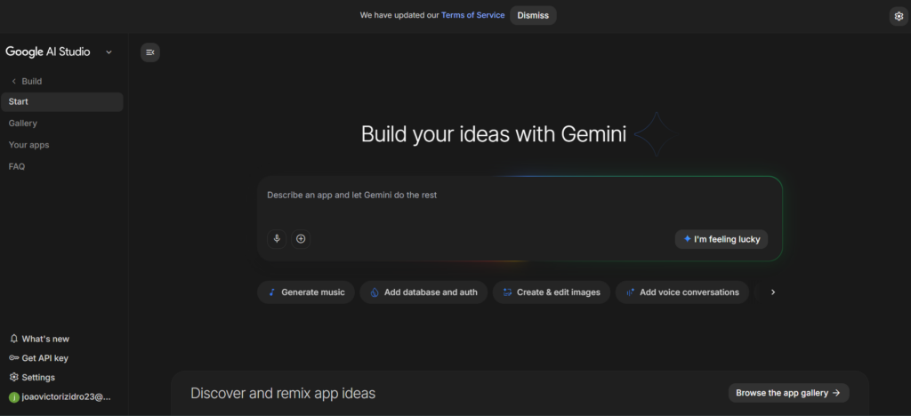 Vá para o site oficial do Google AI Studio. Se você já estiver logado na sua conta Google, entrará direto na interface de desenvolvimento.