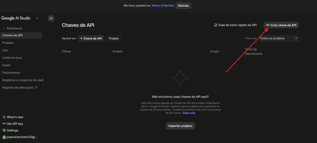 Agora, clique em Criar chave de API (no canto direito, em cima).