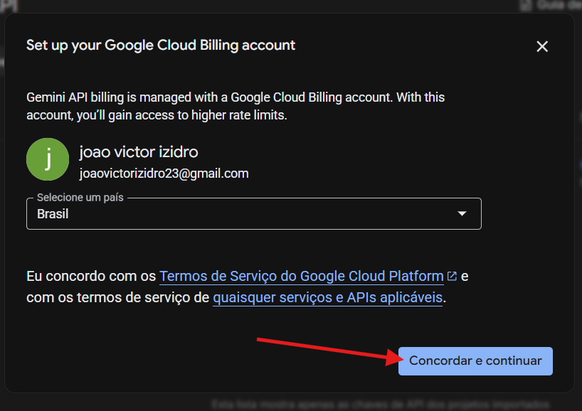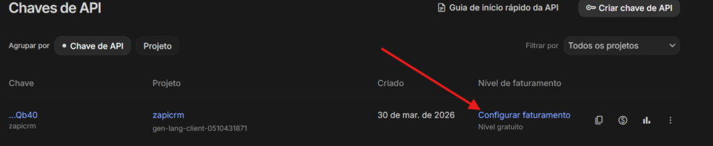 Ira aparecer a sua chave API criada recentemente, clique em Configurar faturamento.