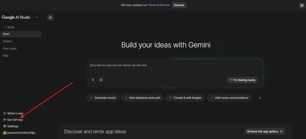 No canto inferior esquerdo da tela (na barra lateral), clique em Get API key.