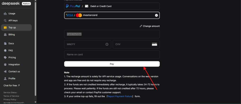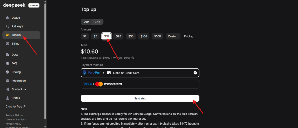 No menu (lado esquerdo), clique em Top up, e coloque U$10,00, então adicione o método de pagamento, e clique em pay.