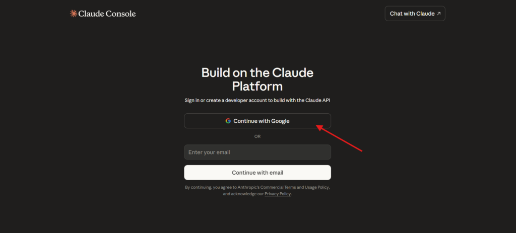 Antes de tudo, acesse a Claude API Platform, e faça login com sua conta Google.