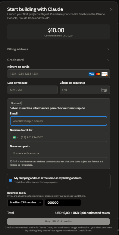 Escolha um valor de saldo, recomendamos U$10,00. Em seguida adicione seu endereço e o cartão de crédito.