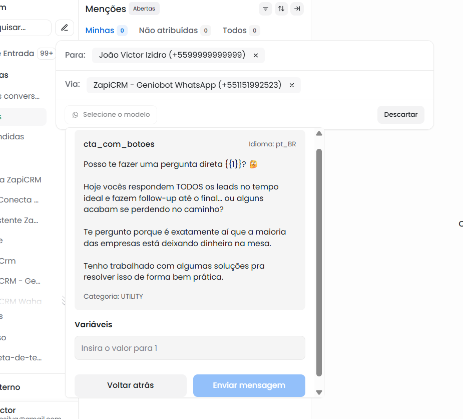 Selecione uma caixa de entrada. (Se for utilizar uma conta WhatsApp Business com a API oficial, será necessário um template já configurado.)